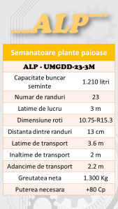 Semanatoarea pentru plante PAIOASE fara sistem de fertilizare marca ALP este folosita pentru semanatul de prezicie a plantelor PAIOASE precum GRAU, ORZ, OVAZ, LUCERNA, RAPITA etc.